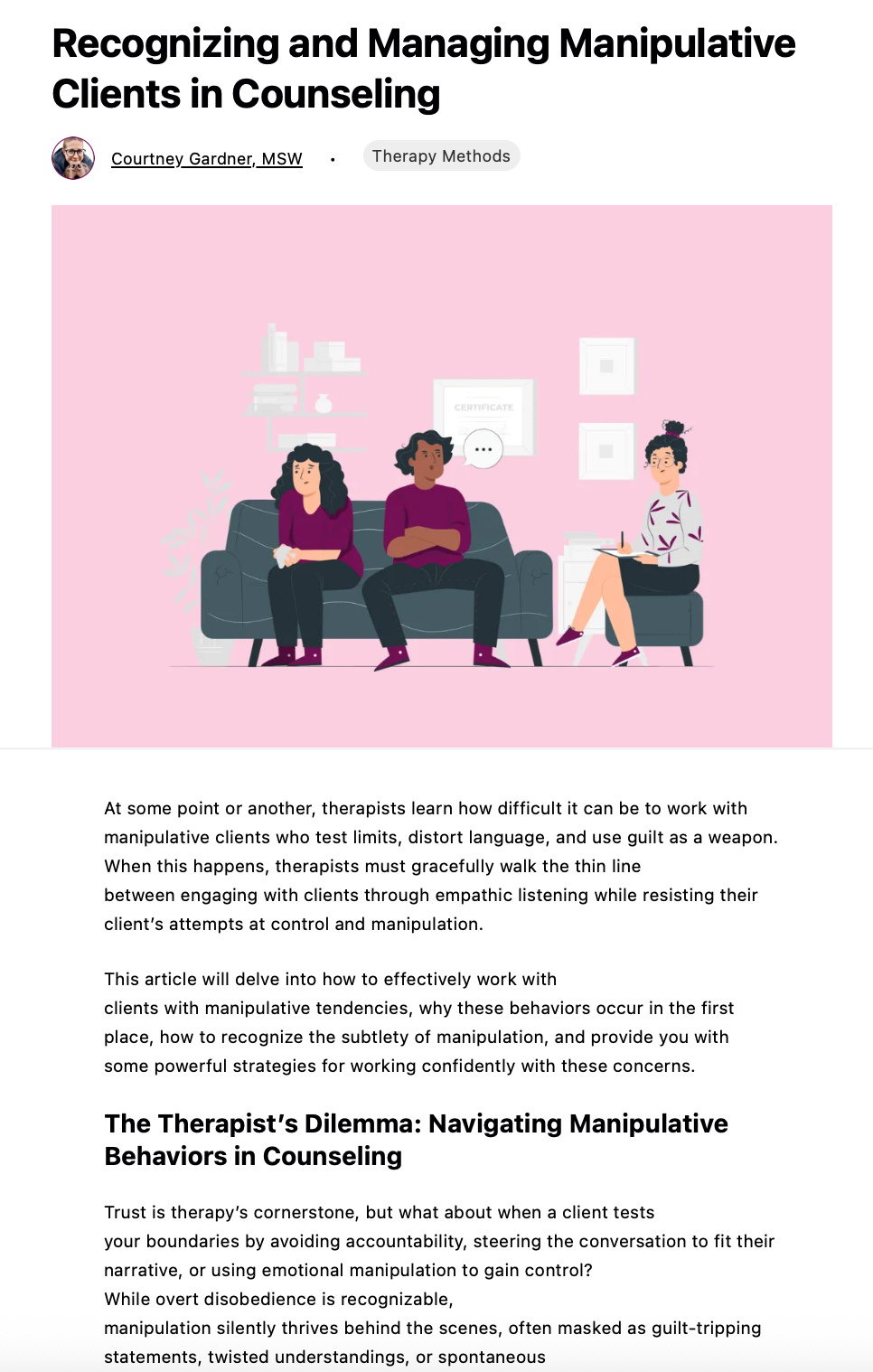 Client: Mentalyc (Mental health practice management platform)Project: Comprehensive guide on recognizing and managing manipulative clients in counselingThe Problem: Therapists regularly encounter clients who use manipulation tactics - from guilt-tripping to boundary testing - but often lack structured approaches for addressing these behaviors while maintaining therapeutic rapport. Existing resources either pathologized clients or provided overly rigid responses that damaged therapeutic relationships.Unique Complexity: This topic required balancing firm boundary-setting with therapeutic empathy, distinguishing between conscious manipulation and trauma-informed survival behaviors, and providing culturally sensitive guidance that didn't stereotype or blame clients.